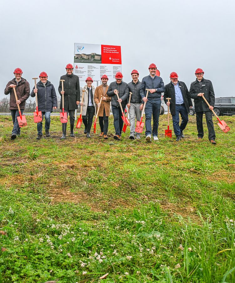 Gemeinsam mit der Sparkasse Bodensee wurde dieser Auftakt trotz wechselhaftem Wetter in großer Runde gefeiert. Frank Lammering (stv. Vorsitzender des Vorstands, Sparkasse Bodensee), Stefan Fehringer (1. stv. Bürgermeister Gemeinde Kressbronn) und Mona John (Referentin Immobilieneinkauf / Projektentwickler, Sparkasse Bodensee) sprachen über die Bedeutung des Quartiers für die Gemeinde.