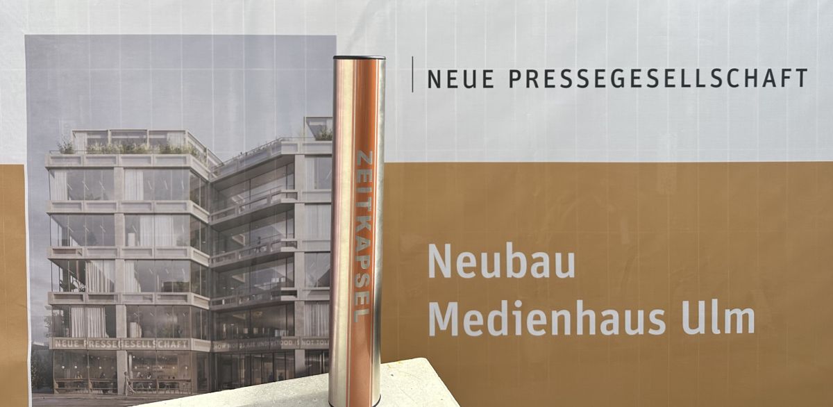 Nach den Reden vom Vorsitzenden der Geschäftsführung Andreas Simmet, des Oberbürgermeisters der Stadt Ulm Martin Ansbacher und dem Architekten Markus Allmann wurde die Zeitkapsel mit aktueller Ausgabe der Südwest Presse, einem Smartphone mit digitalen Angeboten der NPG sowie den Bauplänen in das Fundament eingelegt. Ein symbolischer Akt, der Tradition und Zukunft verbindet.