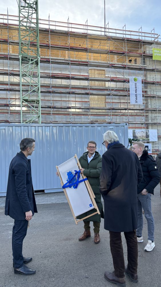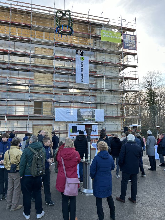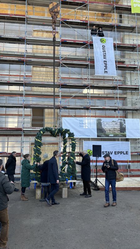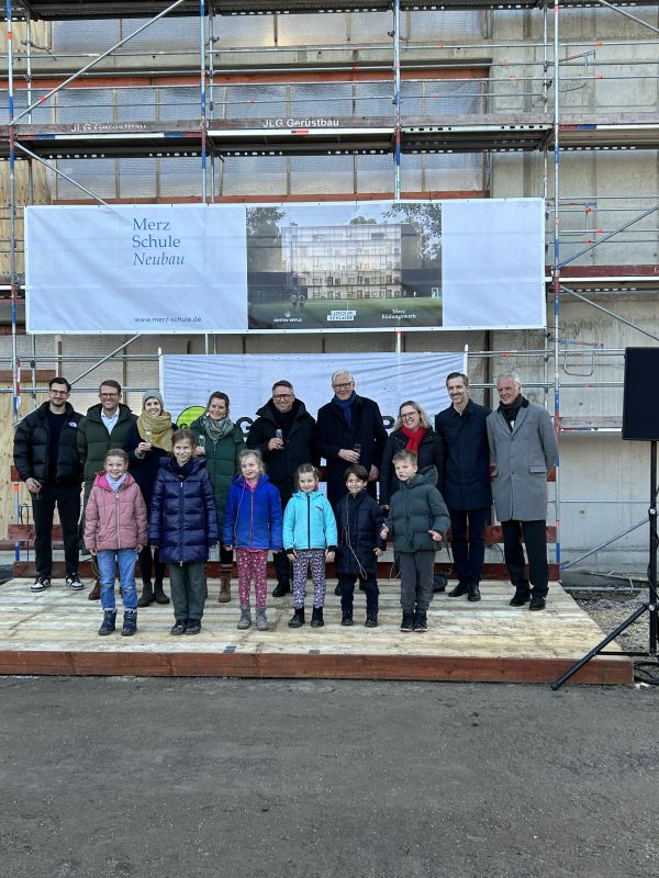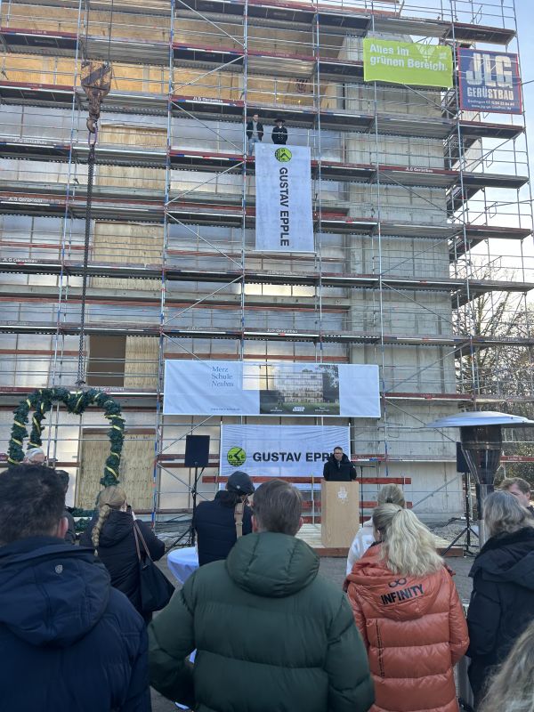 Letzte Woche lud die Merzschule zum Richtfest an der Baustelle ein. Herr Markus Merz berichtete in seiner Ansprache von der termingerechten Fertigstellung des Rohbaus. Er betonte die partnerschaftlich vertrauensvolle und fast schon freundschaftliche Zusammenarbeit aller Projektbeteiligten auf Augenhöhe. Nach dem Richtspruch durch den Generalunternehmer Gustav Epple Bauunternehmung GmbH folgten einige Begehungen der Baustelle. Gemeinsam mit Schülern und Lehrern feierten abschließend alle Beteiligten bei schwäbischen Delikatessen den bisherigen Projekterfolg.