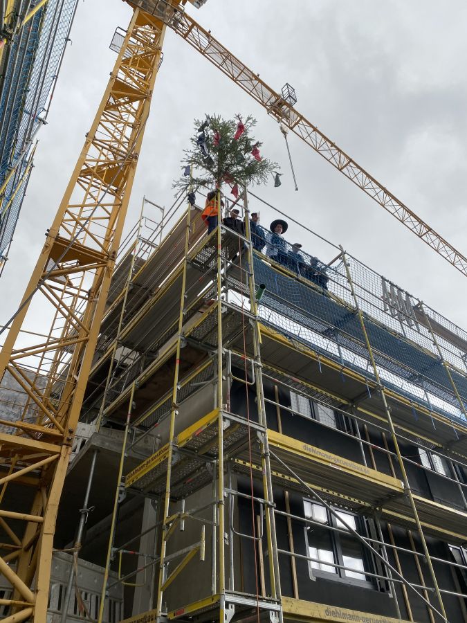 Letzte Woche wurde nun das Richtfest gefeiert. Zum Auftakt des Events gab es eine kurze Ansprache durch Bürgermeister Herr Buß, in der unter anderem die aktuelle Wohnungsnot thematisiert wurde. Mit der Erschließung des Areals trägt die Stadt Plochingen aktiv zur Verbesserung der städtischen Wohnsituation bei. Nach dem Richtspruch durch den Bauunternehmer Wolfer & Goebel setzte man sich für einen entspannten Austausch mit Linsen und Spätzle in klassisch unkompliziertem Baustellenflair im Rohbau zusammen und feierte den bisher gemeinsam erlangten Erfolg.