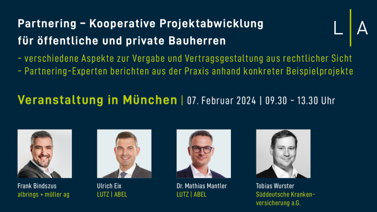 Am 7. Februar 2024 findet das Event Partnering – Kooperative Projektabwicklung für öffentliche und private Bauherren von den Rechtsanwälten Lutz | Abel in München statt.