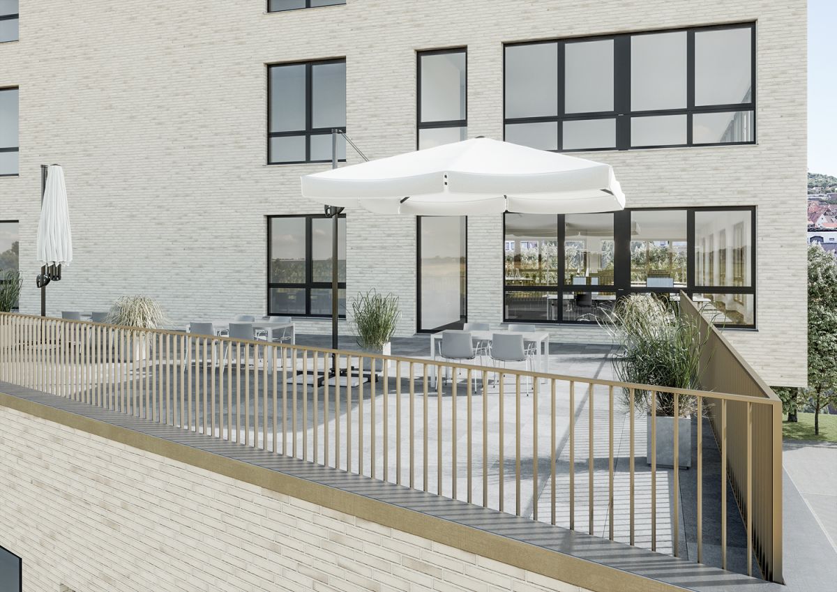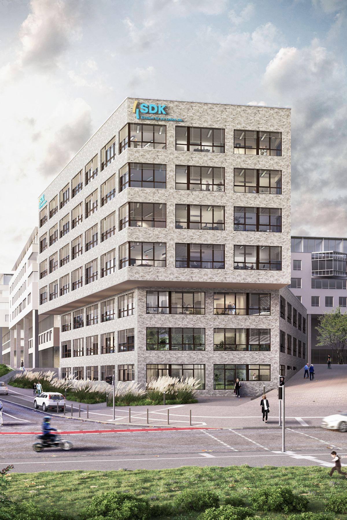 Im Zuge der Campusentwicklung der SDK wurde eine Projektentwicklung als Investitionsprojekt auf einem noch unbebauten Grundstück durchgeführt. In Abstimmung mit dem Auftraggeber und den örtlichen Behörden konnte durch eine vorgeschaltete Projektanalyse zusätzliches Bauflächenpotenzial für den Gesamtcampus identifiziert werden. So wird das Areal auf dem Raiffeisenplatz durch die Nachverdichtung optimal genutzt. Es entsteht ein Büro- und Verwaltungsgebäude mit maximaler Wirtschaftlichkeit. Die gewählte Gebäudeaufteilung und Flächenkonzeption gewährleistet ein individuell nutzbares Vermietungsobjekt mit maximaler Flexibilität und Drittverwendungsmöglichkeit. Das Gebäude bietet modular erweiterbare Mietflächen von 350 m² bis 5.000 m².